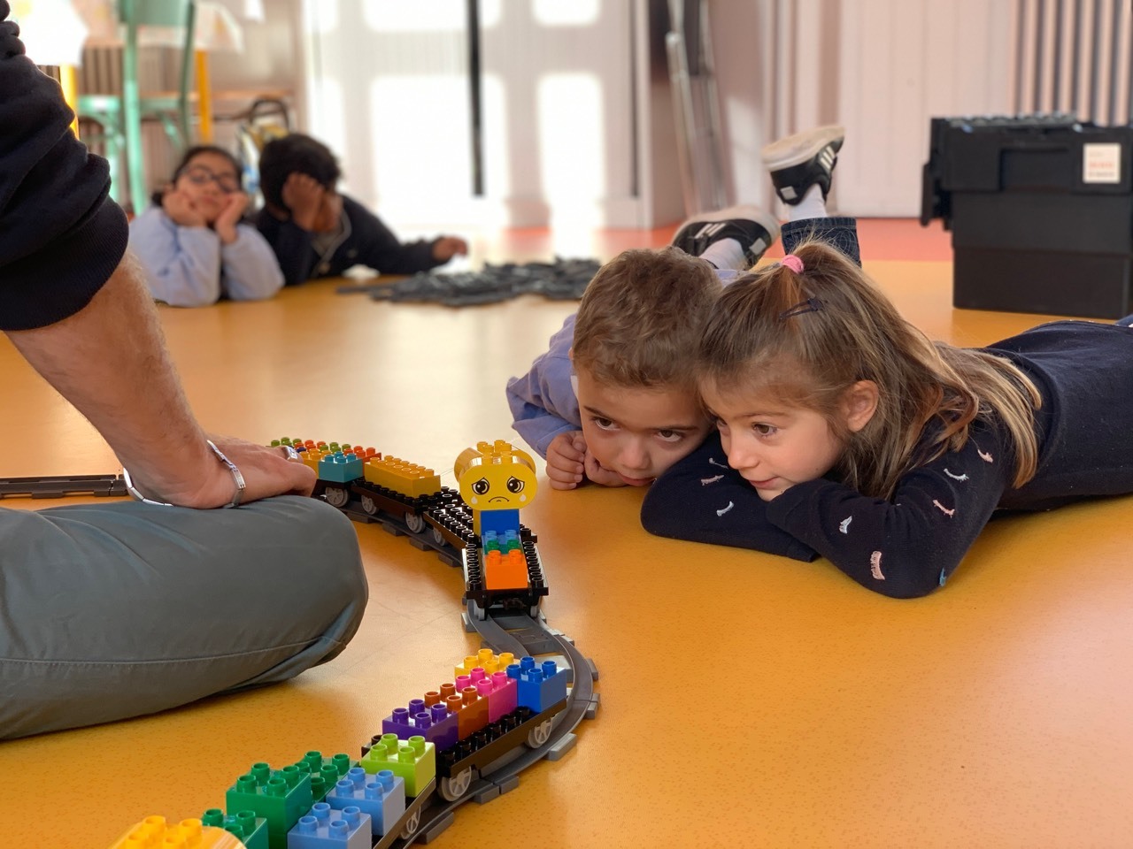 Aujourd’hui, en suivant un protocole strict de désinfection du matériel entre les classes, les maternelles ont pu assister à une animation pédagogique LEGO.