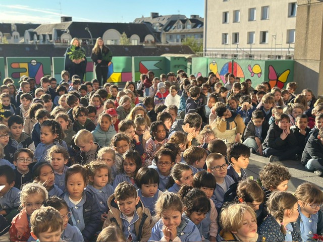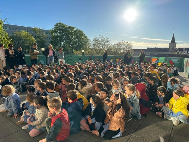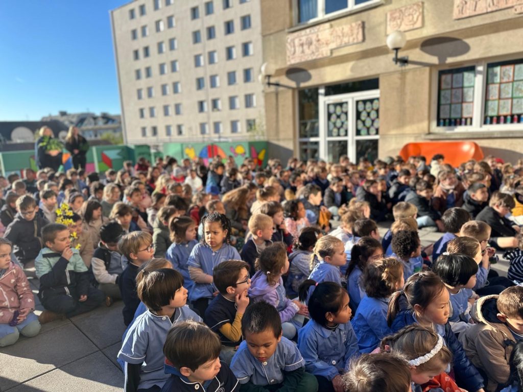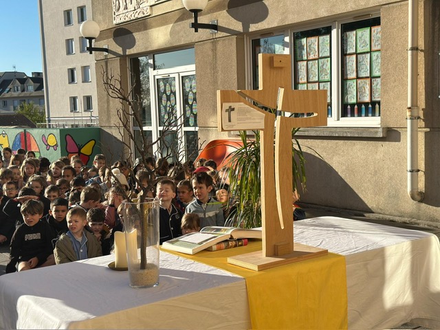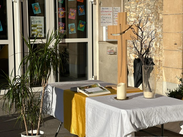 Mardi matin, en arrivant à l’école, nous avons célébré Pâques, la résurrection de Jésus., son passage de la mort à la vie. Nous nous sommes tous retrouvés sur la terrasse sous un très beau soleil. Nous avons chanté notre joie et écouté l’évangile du jour (Jean 20, 11-18).