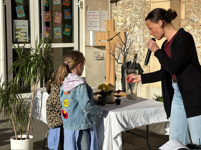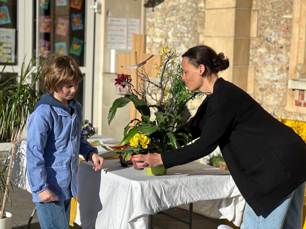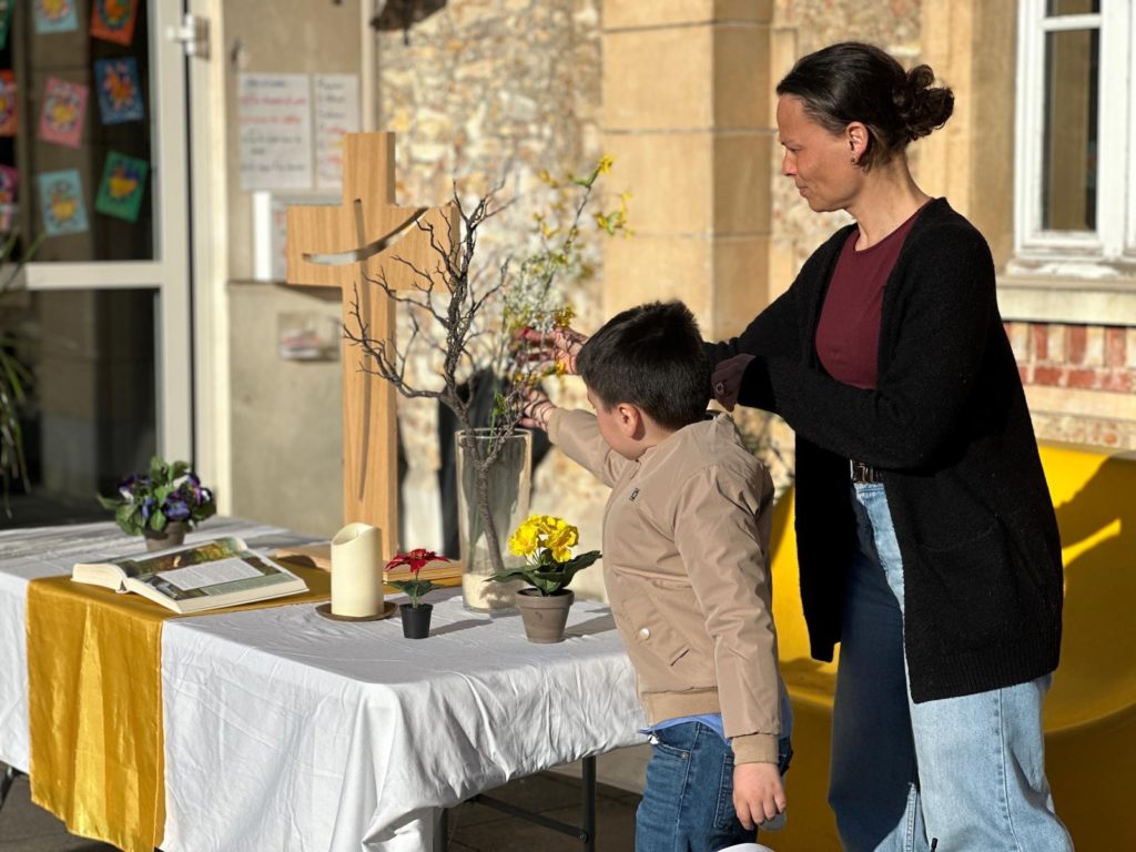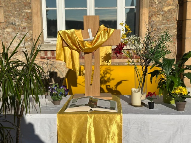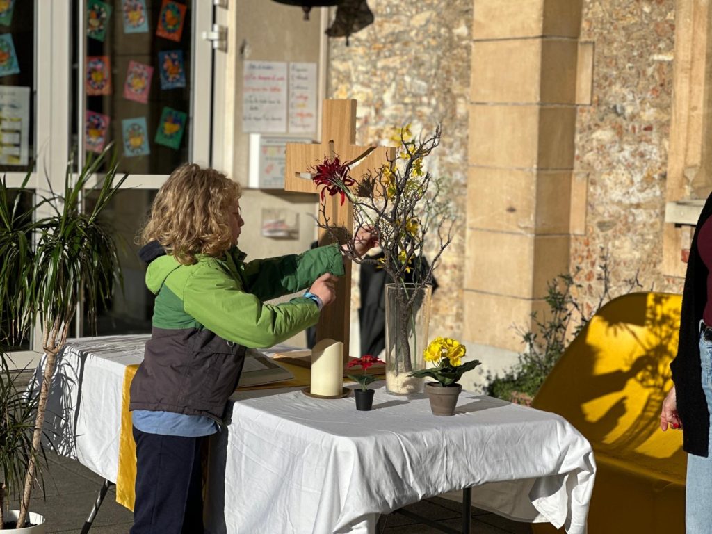 Nous avons allumé un cierge, symbole de la résurrection de notre Seigneur, et sommes venus fleurir la croix, désormais glorieuse, car elle est signe de l’amour infini de Dieu pour chacun de nous.