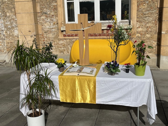 Ce matin, sur la terrasse de l’école, nous nous sommes retrouvés tous ensemble pour fêter la joie de Pâques, celle de la résurrection de Jésus !