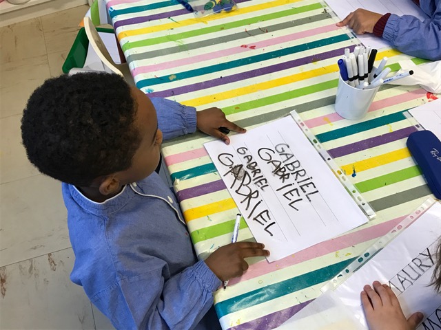 En ce moment, elle aide certains enfants qui ont encore un peu de mal, à écrire leur prénom et à nommer les lettres.