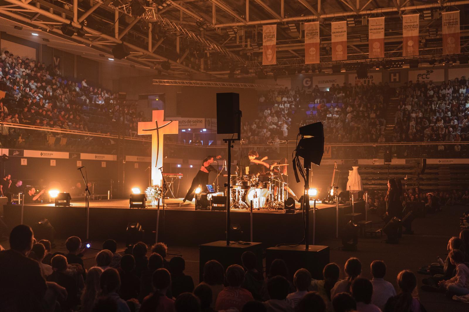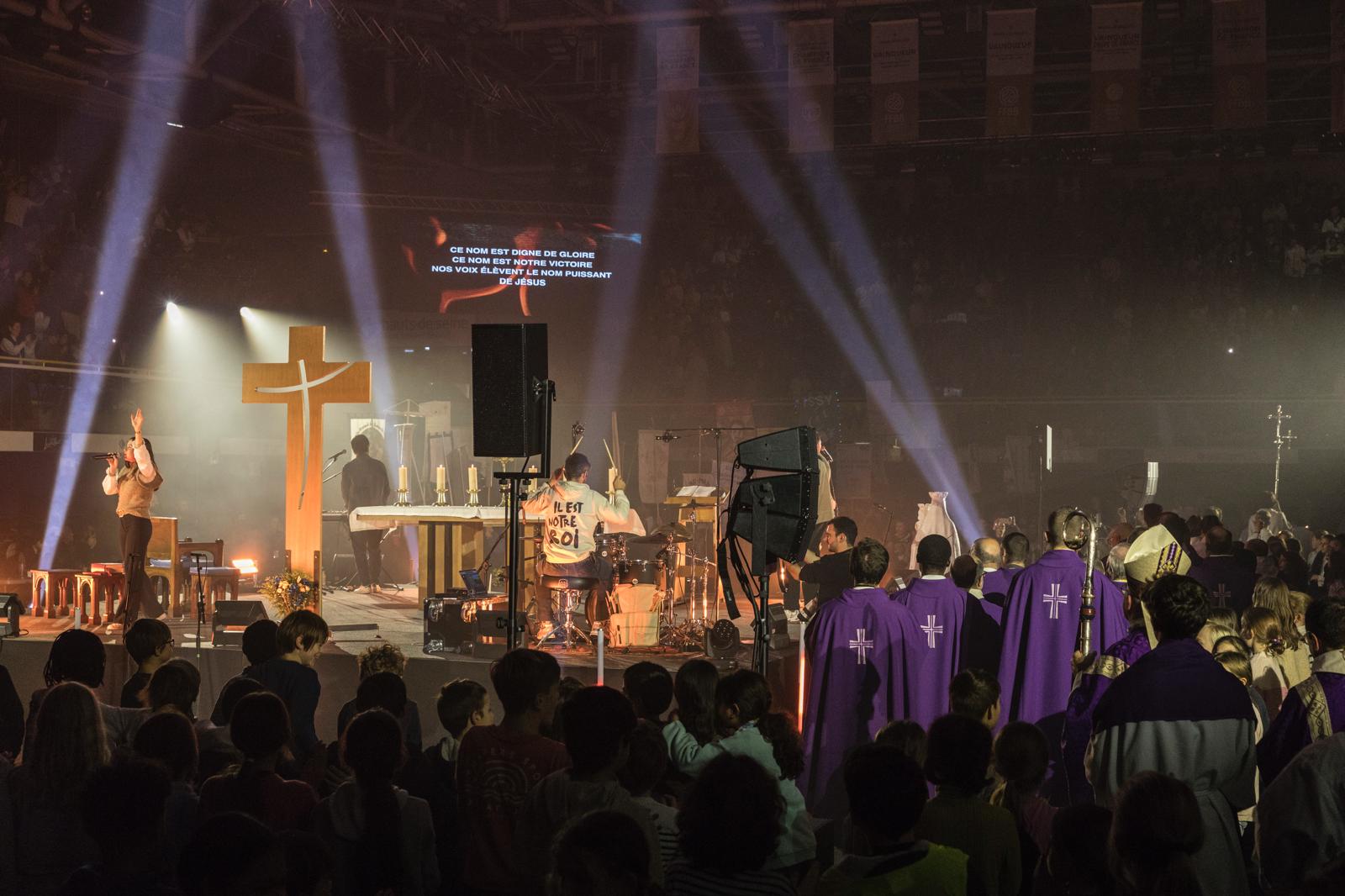 en 2nde partie : un temps de concert suivi d’une messe jubilaire animée par un groupe de louange et présidée par notre évêque, Mgr Rougé.