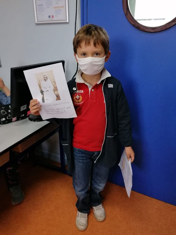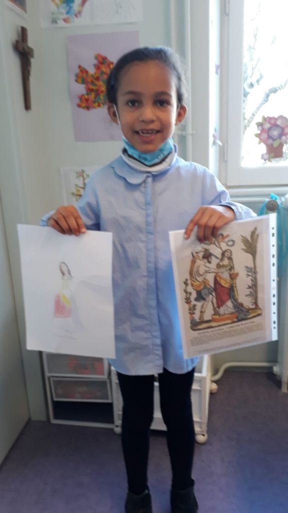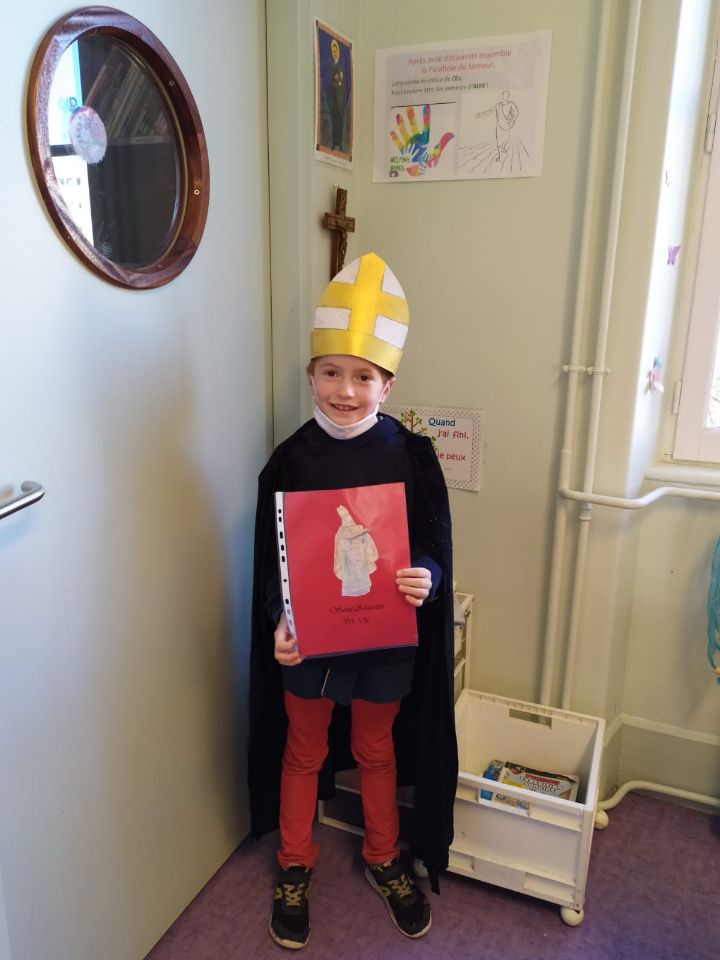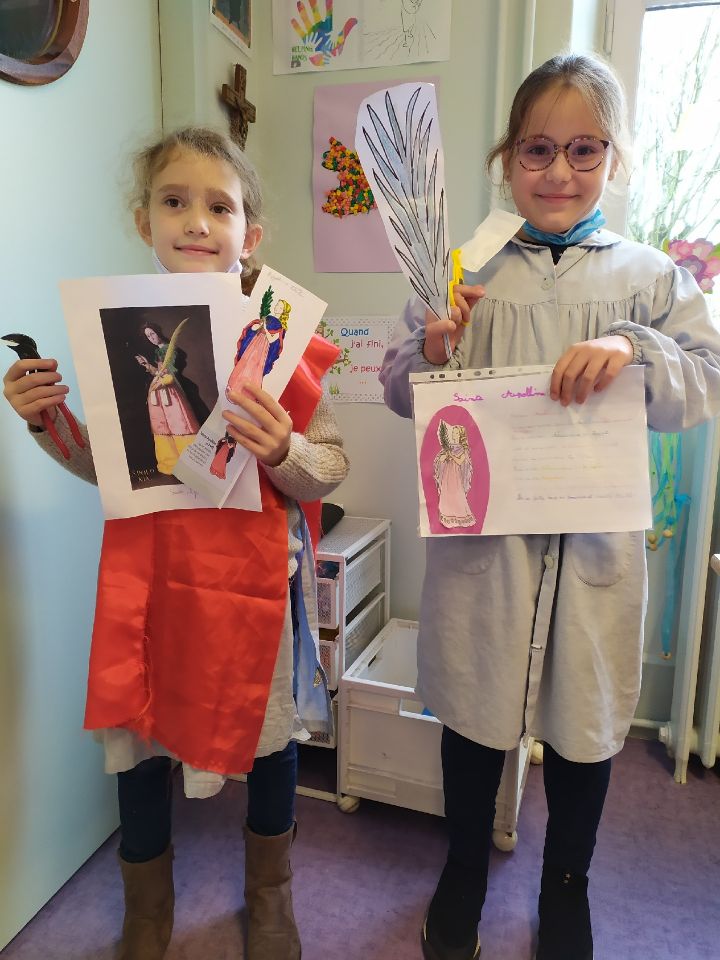 Louis – CM2 – Saint Louis et sa main de justiceSelyan – CM2 – Saint Léonard de NoblatSacha – CM2 – Saint Alexandre avec la crosse et la palme du martyreAugustin – CE2 – Saint Augustin avec sa mître Corentin – CE2 – Saint Corentin avec sa mître, sa crosse et son poissonRomy – CE2 – Sainte Rose de Lima Lena – CE2 – Sainte Hélène Fares – CE2 – Saint François d’AssiseZoé – CM1 – Sainte Zoé Noémie – CM1 – Sainte Noémie Eglantine – CM1 – Sainte FleurEmie – CM1 – Sainte Emilie de VialarPaul – CM1 – Saint Paul de Tarse (Saul) Léa – CM1 – Sainte Léa Solal – CM1 – Saint Cyrille Leïa – CE2 – Sainte Léa Louis – CE2 – Saint Louis (Louis IX) Aksel – CE2 – Saint Alexandre Valentine – CE2 – Sainte Valentine Amandine – CE2 – Sainte AmandineSixtine – CM1 – Sainte Jeanne d’ArcArthur – CM1 – Saint Arthur de GlastonburyMarie-Lou – CM1 – Sainte Louise de MarillacRaphaël – CM1 – Saint Raphaël Arnáiz Barón, religieux cistercienYohann – CM1 – Saint Jean l’évangélisteEthan – CM1 – Saint Nathanaël ou Barthélémy, apôtre de JésusEmrys – CM1 – Saint Ambroise de MilanKytterie – CM1 – Sainte QuitterieLiam – CE2 – Saint Guillaume de BourgesLisa – CE2 – Sainte Elisabeth, mère de Jean-BaptisteAlix – CE2 – Bienheureuse Alix LECLERCCalie – CE2 – Sainte LucieRomy – CE2 – Sainte Rose de LimaClémence – CE2 – Bienheureuse ClémenceMila – CE2 – Sainte MarieAlexia – CE2 – Saint AlexisApolline et Apolline – CE2 – Sainte Apolline, patronne des dentistesEvann – CE2 – Saint Jean l’évangélisteAlicia – CE2 – Bienheureuse Alix LeclercEdène – CE2 – Sainte VictoireAngèle – CE2 – Sainte Angèle de FolignoLouise – CE2 – Sainte Louise de MarillacThéodora – CM2 – Sainte ThéodoraAugustine – CM2 – Sainte AugustineEloïse – CM2 – Bienheureuse Héloïse, ermite bénédictineElsa – CM1 – Sainte Elisabeth de Hongrie et sa rose